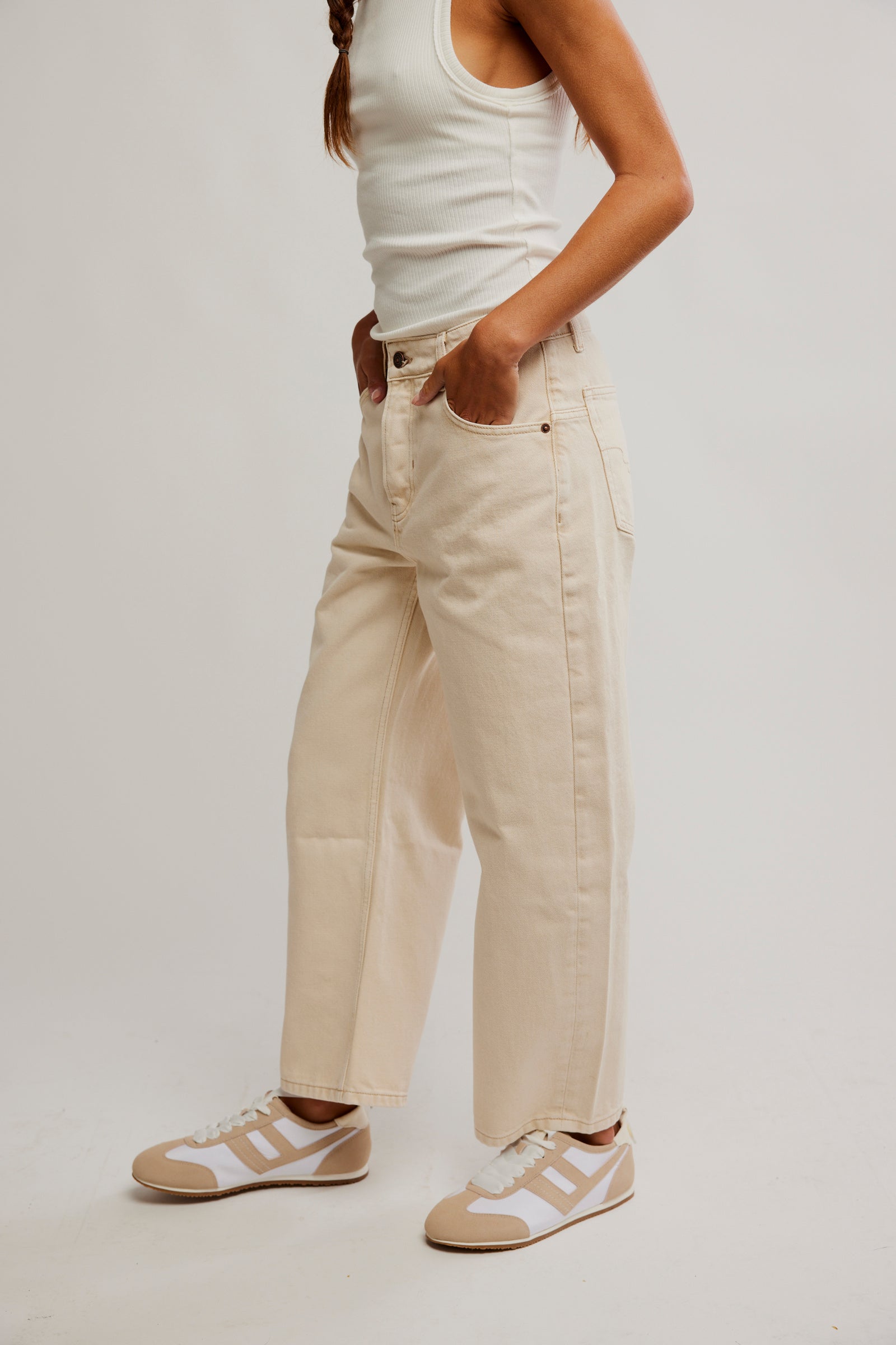 Fit: Low-rise, dropped barrel fit