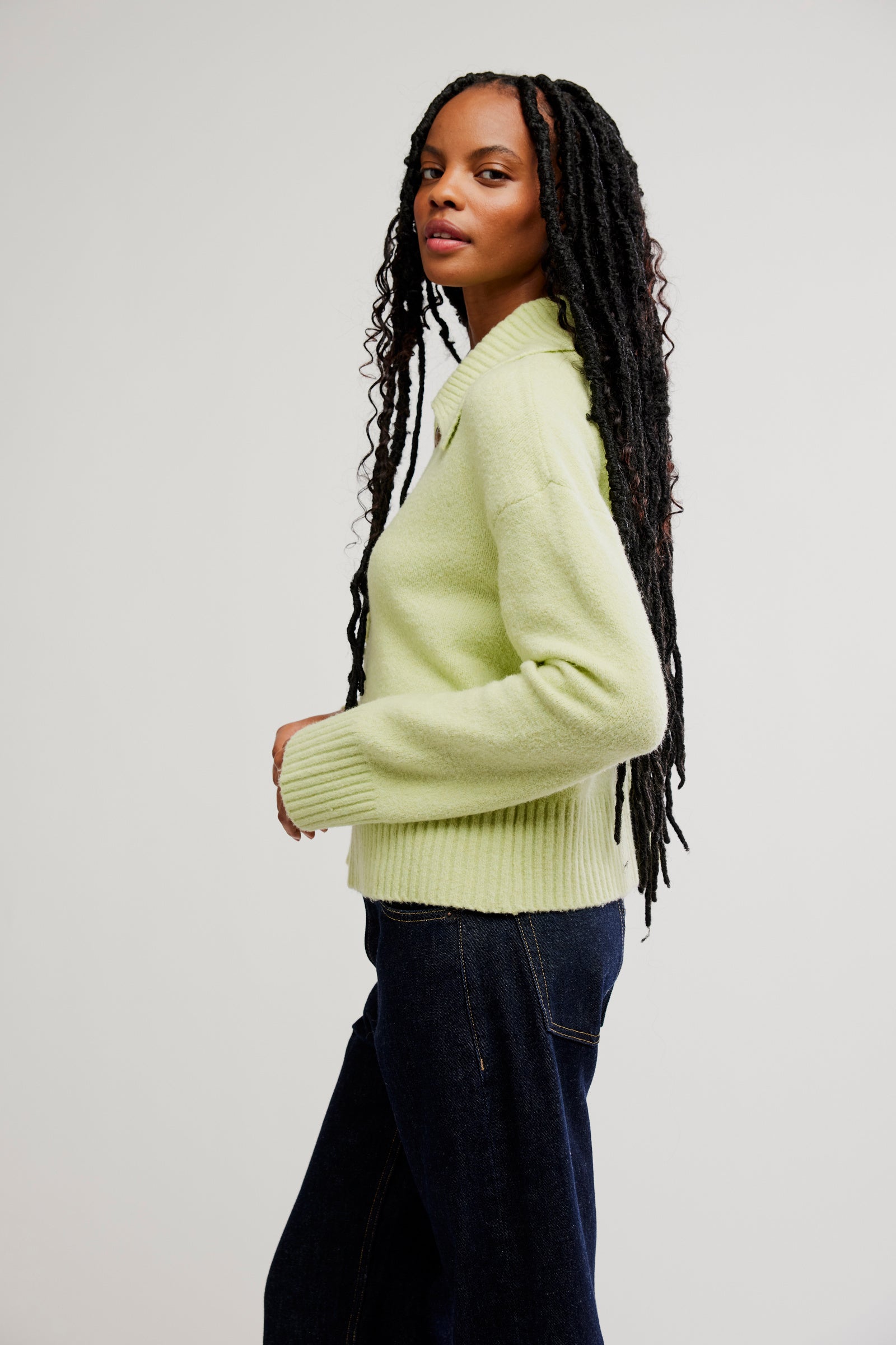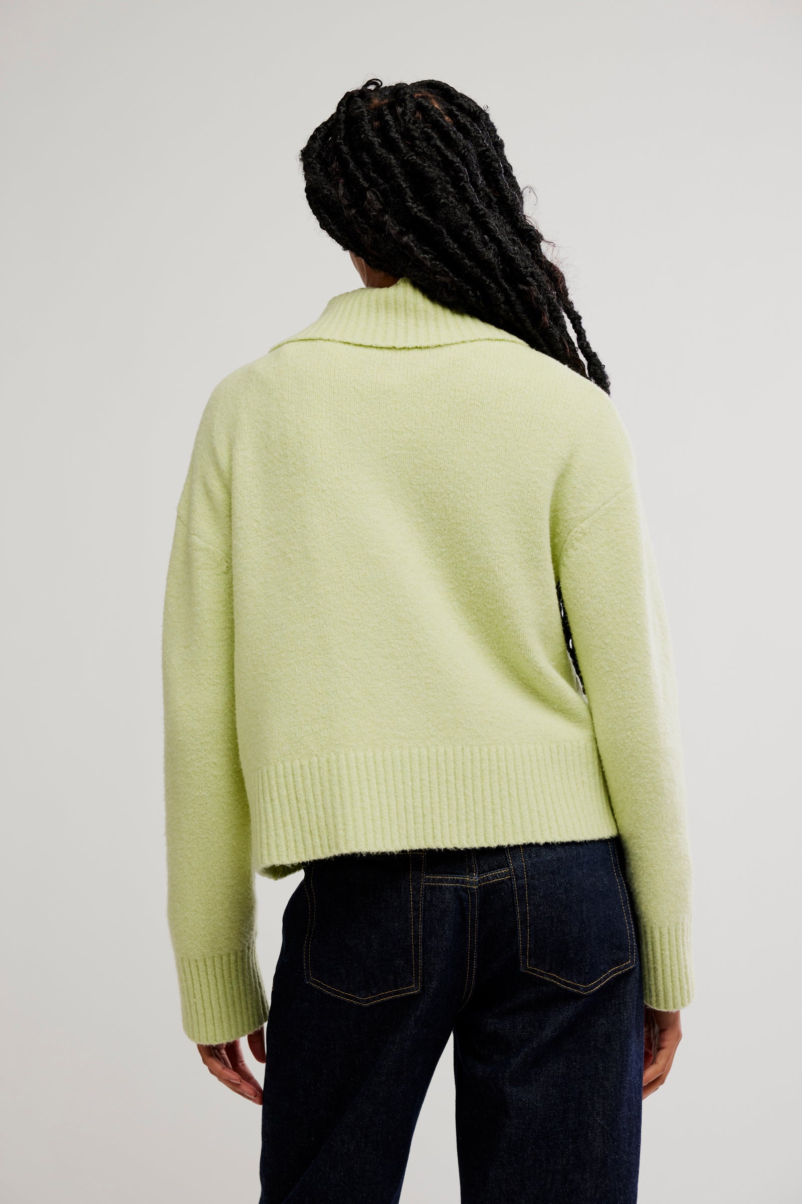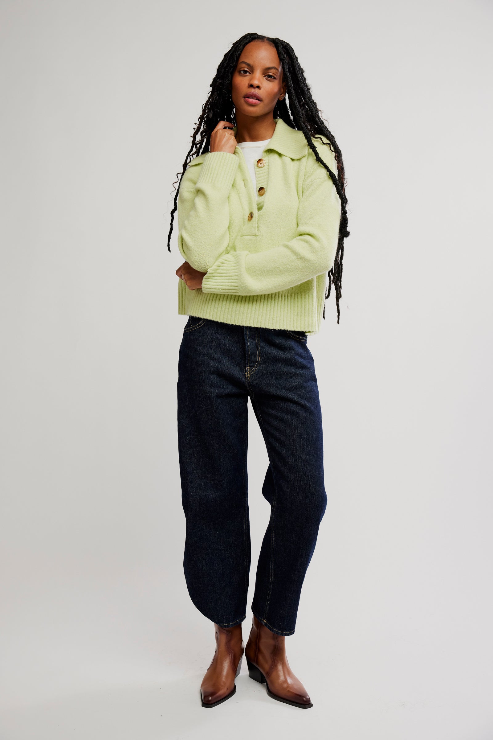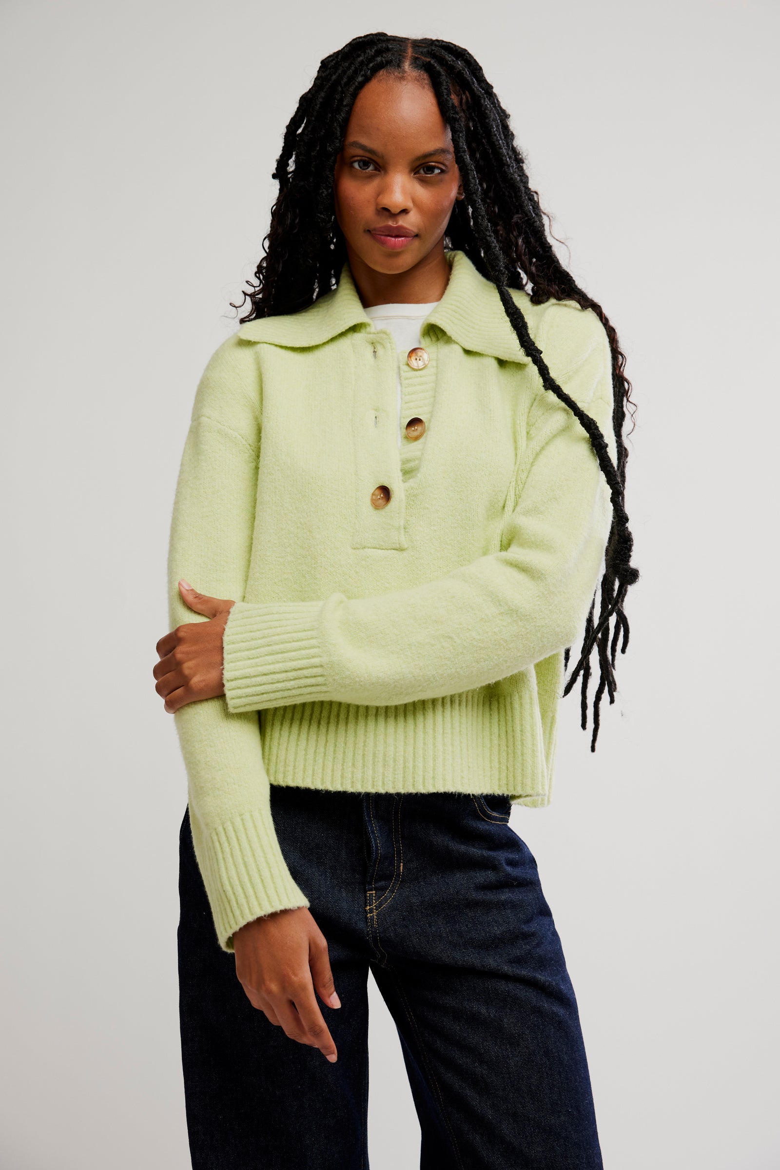 The definition of cozy, this sweater features a classic polo-inspired silhouette, a cotton-blend knit fabrication, and charming tortoise shell buttons.